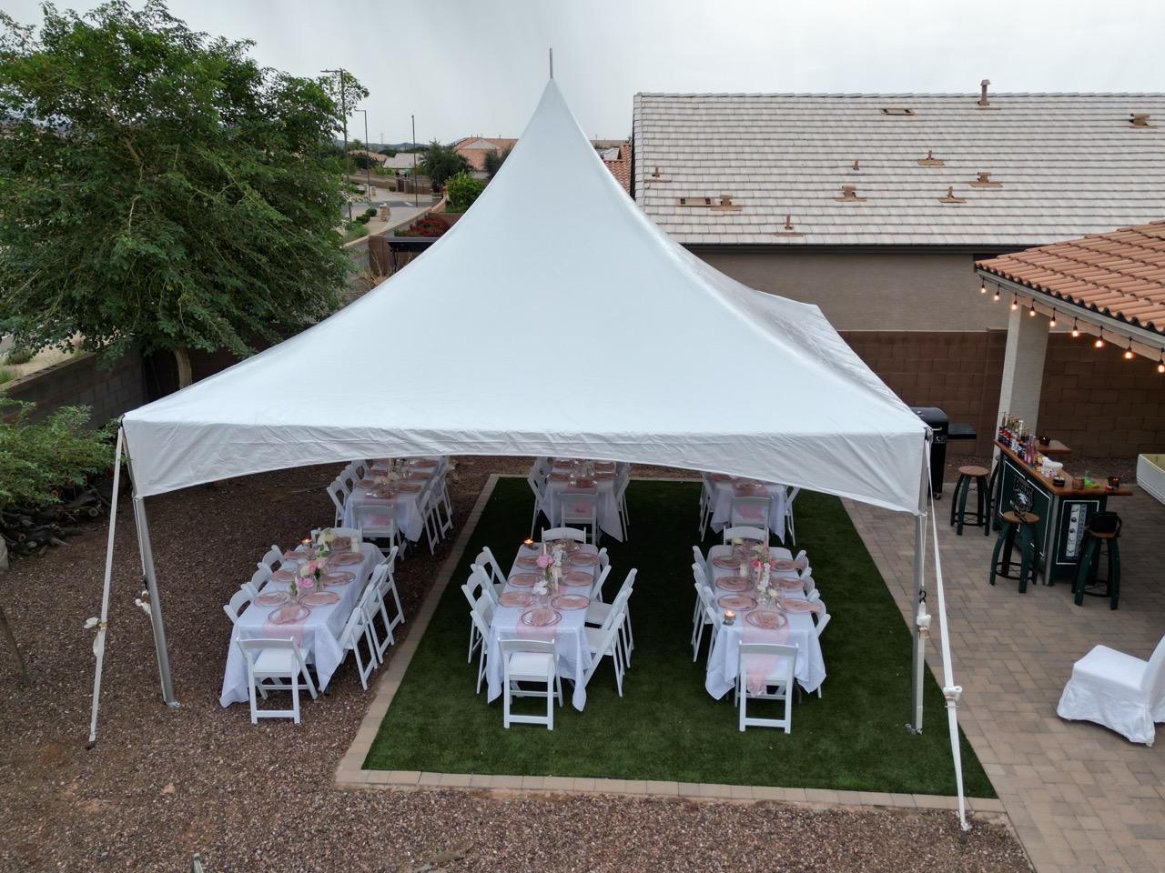 Our 20×20 high peak tents, plus 20×10 and 10×10 pop-up canopies, are delivered and installed for weddings, backyard parties, graduations, and corporate events across the West Valley.